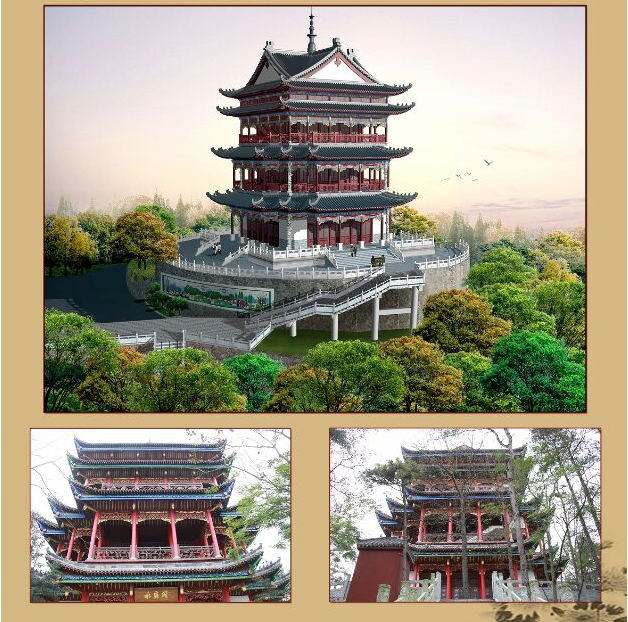 水府阁:高踞于黄闻山顶,悬崖如削,与潇湘八景之一“渔村夕照”隔江对峙,誉为“潇湘第一阁”。